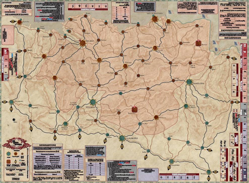 Sono presenti una mappa principale (o mappa settentrionale), che mostra la Navarra, le province basche e parte della Cantabria, Burgos e La Rioja, e una mappa secondaria che riflette le regioni del resto del paese, dove scoppiò la rivolta carlista e dove le spedizioni inviate dal Nord possono operare.